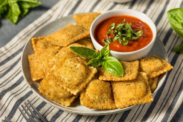 Ponovite postupak sa preostalim raviolima. Pospite parmezanom i peršunom i servirajte sa sosom za umakanje. Uživajte!Možda ćete želeti da napravite i domaće raviole.