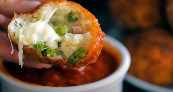 Najbolje je da uvaljate i panirate sve kuglice od pirinča pre nego što počnete da pržite, jer je prženje brzo. Sipajte ulje u duboki lonac na srednjoj vatri. Kada se ulje zagreje, dodajte loptice od pirinča u serijama i pržite oko 3 minuta, dok ne dobiju zlatno-smeđu boju. Prebacite na papirne ubruse, odmah posolite i servirajte uz sos po želji. Možda ćete želeti da napravite i slavske kuglice od sira sa kikirikijem i slaninom.