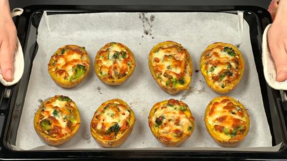 Pečene krompire presecite na pola i izdubite sredinu. Izdubljeni deo krompira izgnječite i pomešajte sa pripremljenim filom, umućenim jajima i rendanim sirom. Napunite krompire pripremljenim nadevom, pospite još malo sira i pecite na 180°C još 15 minuta dok ne dobiju zlatnu koricu.