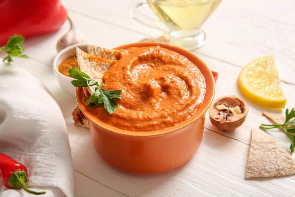 U istom tiganju zagrejte 2 kašike maslinovog ulja. Dodajte luk i pržite 4 minuta. Dodajte beli luk i pržite još 1 minut. Ako u bilo kom trenutku crni luk počne da se lepi za tiganj, možete dodati još jednu kašiku ulja. Paprike, tostirane orahe, čili papričice, kim, nar i limunov sok, prezle, šećer, proprženi luk, beli luk i preostale 2 kašike maslinovog ulja ubacite u blender. Začinite sa ½ kašičice soli i blednirajte dok smesa ne postane glatka. Probajte začin i dodajte još soli ili bibera ako želite. Servirajte sa malo tortilja čipsa ili krekera. Uživajte! Možda ćete želeti da isprobate i najbolji recept za domaći kikiriki puter.