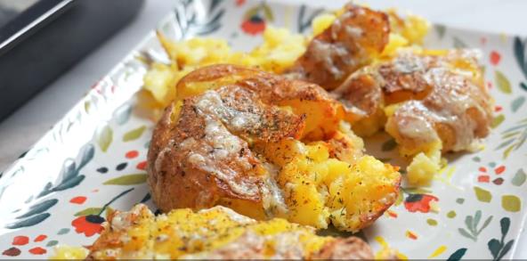 Na sir poređajte kuvani krompir, pa svaki krompir pritisnite (zgnječite) dnom čaše ili šoljice – ne do kaše, već da malo pukne. Posolite, pobiberite i pospite sušenim belim lukom i mirođijom. Prelijte sve uljem.