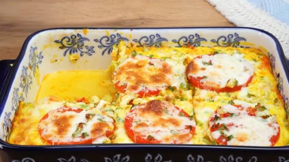Na malo maslinovog ulja propržite luk i šargarepu. Dodajte sitno seckani beli luk i propržite još 2 minuta. Dodajte oceđene tikvice i sitno seckanu žutu papriku i 1 paradajz. Sve dobro promešajte. Začinite crnim biberom i italijanskim začinskim biljem. Smesu sipajte u nauljen pleh ili vatrostalnu posudu. Prelijte smesom od mleka i jaja pa promešajte. Na vrh poređajte kolutove paradajza i pospite sirom i seckanim zelenim lukom.