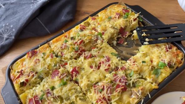 U činiji umutite jaja, pavlaku, krem sir, rendani sir, mladi luk i kobasicu ili šunku. Posolite i pobiberite po ukusu. Preko izgnječenog krompira ravnomerno rasporedite pripremljenu smesu. Po želji pospite još malo rendanog sira odozgo. Pecite u rerni zagrejanoj na 200°C oko 25–30 minuta, dok se ne zarumeni i lepo zapeče.