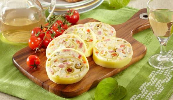 5. Ovaj pripremljen fil stavite preko edamera, pa poređajte isevkane masline. Uvijte u rolat uz pomoć folije i prekrijte ga folijom. Čuvajte rolat u frižideru preko noći, a pre serviranja sklonite foliju.