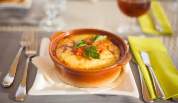 1. Krompir oljuštite, skuvajte, isecite na kolutove i poređajte u pouljenu vatrostalnu činiju.
