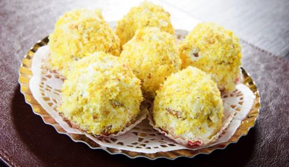 4. Šunku isecite na krupnije kocke, a kačkavalj izrendajte. Od pripremljene smese pravite kuglice, u svaku svaku stavite komadić šunke i valjajte u rendani kačkavalj. Dobro ohladite i poslužite.