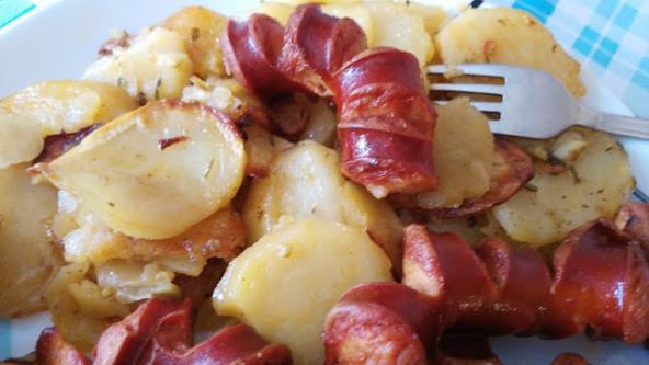 Tepsiju pouljuti pa staviti u rernu da se dobro ugreje pa u nju dodati pola krompira, na sredinu iseći luk pa pokriti ostalim krompirom. Poredjati kobasice pokriti i peći na 200 stepeni C oko 40 min.da lepo porumeni