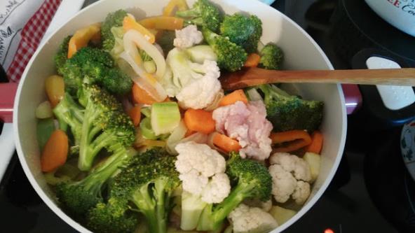 Na ulju propržiti na kolutove isečen praziluk, pa isto tako dodati papriku, šargarepu na kolutove piletinu, zatim tikvice na kockice i na kraju brorkoli iskidane cvetove.