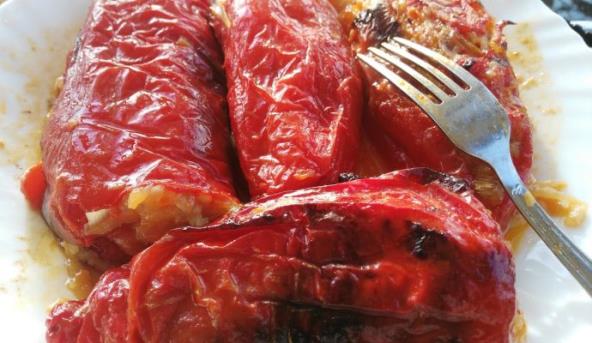 2. Dodati kuvan pirinač, ajvar, začin, biber. Sve dobro izjednačiti i time puniti paprike (ako su paprike suve potopiti ih u toplu vodu da odstoje oko 30 minuta ocediti).