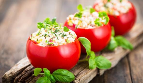 3.Napunite paradajz, pokrijte ga poklopcem i pecite u podmazanom plehu na 170 stepeni 15-20 minuta.