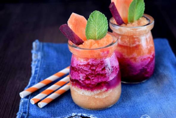 Za sloj sa ananasom: Pomešajte sve sastojke u blenderu i izmiksajte. Sipajte smesu u čaše i stavite u zamrzivač na nekih 20 minuta.