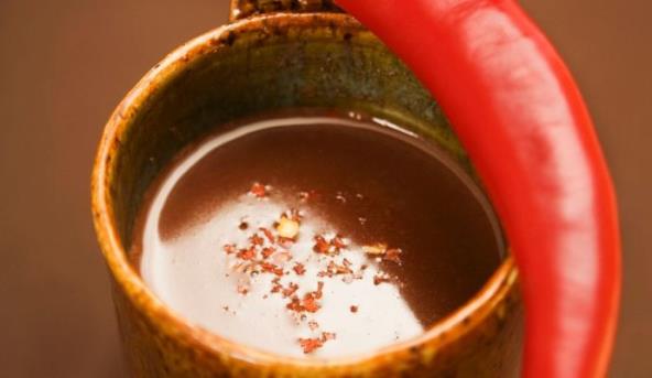 Dobro zagrejte mleko sa izva đenim semenom vanile i 10 minuta ostavite da stoji. Procedite i mleko ponovo zagrejte. Dodajte čokoladu i 1,25 dl vode, i uz mešanje rastopite. Dodajte i med, so, čili, rum i dobro promešajte. Služi se veoma toplo.