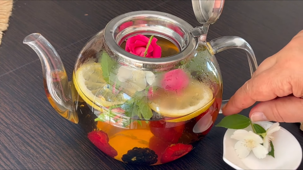 U čajnu napravite zeleni čaj i ostavite 5 minuta. Izbacite listiće čaja, pa dodajte led, cveće, nanu, kupine i maline, kao i limun. Stavite malo u frižider da se ohladi i služite.
