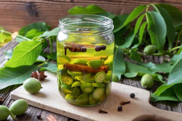 Pre nego što krenete da čistite orahe stavite rukavice. Onda ih očistite od peteljki, pa ih operite i osušite. Svaki orah probušite iglom, a ukoliko su krupniji isecite ih na polovine. Još je bolje ako ih sitno iseckate, jer će liker biti aromatičniji. Pripremljene orahe (iseckane ili probušene) poređajte u veliku teglu i pospite šećerom. Prekrijte gazom, pa teglu stavite na sunce da stoji 28 dana. Ukoliko primetite da se šećer ne rastapa, možete blago protresti teglu s vremena na vreme. Kada prođe ovih 28 dana sipajte rakiju. Sada hermetički zatvorite i ostavite da stoji još 40 dana na suncu. U ovom trenutku, pre nego što je zatvorite, možete da dodate začine po želji. Jedino limun dodajte krupno sečen sa sve korom tek posle 30 dana.Nemojte da stavljate sve začine i voće, nego odaberite. Kada istekne rok od 40 dana izvadite orahte i začine ili voće, pa pretočite rakiju u sterilisane flaše. Ako ste seckali orahe onda procedite. Flaše dobro zatvorite i čuvajte na hladnom i tamnom mestu najmanje 2 meseca da rakija "sazri".