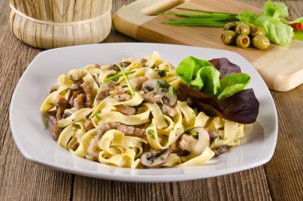 1. Testeninu skuvajte u dosta slane vode da bude al dente, a svinjetinu isecite na tračice debljine 1/2 cm. I jedno i drugo pržite na 2 kašike ulja oko 6 minuta, posolite i pobiberite.