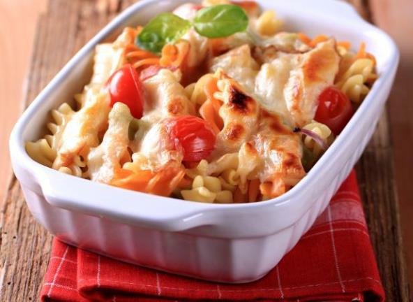 2. Zagrejati maslac, pa propržiti začinsko bilje, meso, paradajz i beli luk. Začiniti prema ukusu. Procediti rezance i presutiih u nauljenu vatrostalnu posudu. Rasporediti preko prodinstano povrće i meso.