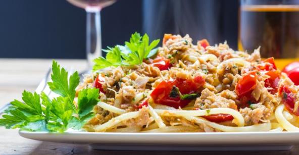 3. Kuvanu testeninu ocedite i pomešajte s tunjevinom, paradajzom i peršunom. Posolite i pobiberite po ukusu.