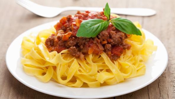 1. Zagrejte maslinovo ulje u dubokom tiganju ili šerpi i pržite iseckanu slaninu dok ne poprimi zlatnu boju. Dodajte iseckan crni i beli luk i pržite dok luk ne omekša. Pojačajte temperaturu i dodajte mleveno meso. Kada se meso isprži dodajte vino i kuvajte dok se količina tečnosti ne smanji za trećinu. Smanjite temperaturu i umešajte paradajz, začine i celer.