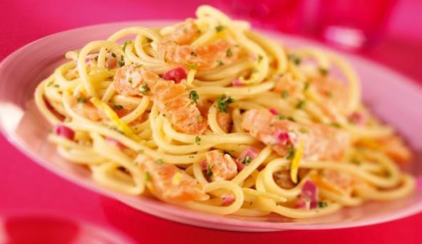 3. Izmešati kuvane špagete s prženim lososom i pripremljenim sosom. Posuti vlašcem.