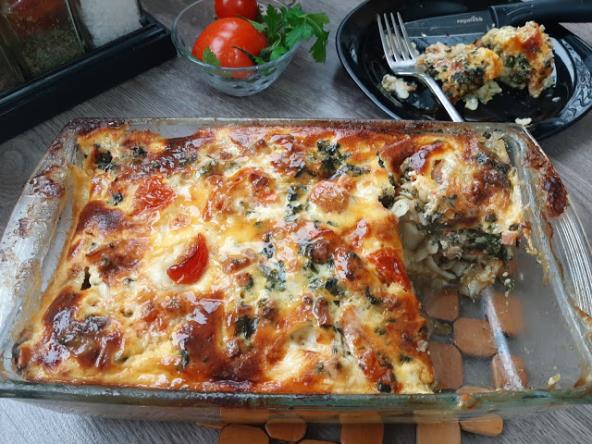 Na ulju propržiti seckan praziluk, dodati seckanu šunku i nju malo propržiti, ubaciti baren i seckan spanać, beli luk, so i na kraju sečen paradajz. Testeninu rasporediti u manji pleh pa odozgo sipati i izravnati nadev. Staviti i krupne kocke sira.