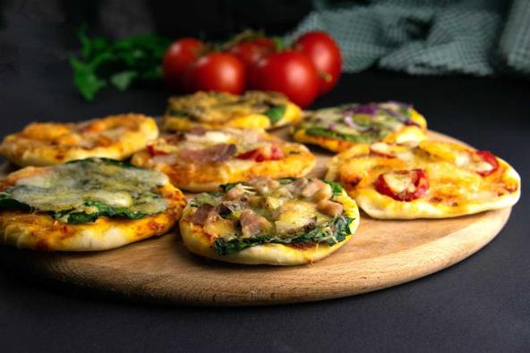 U veću posudu pomešajte brašno i so. Napravite rupu na sredini i sipajte smesu sa kvascem. Mesite dok testo ne postane glatko na dodir. Dodajte još brašna ako je potrebno. Testo podelite na osam delova, pa svaki ravaljajte u kuglu i stavite na pleh obložen pek papirom i spljoštite rukom. Premažite sosom od paradajza, a zatim dodajte prelive koje smo vam predložili i pecite pet minuta. Zatim rotirajte i pecite dodatnih pet minuta ili dok osnova ne postane hrskava.