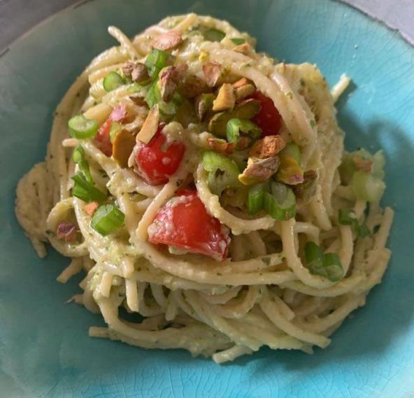 U tiganju na malo maslinovog ulja propržite sitno seckane tikvice i mladi luk. Pred kraj dodajte sitno seckani beli luk. U sos možete dodati i pesto ako imate, a ako ne nije neophodno. Zatim u to sipajte pola litre supe od povrća i malo belog vina. U međuvremenu skuvajte špagete, odvojite jednu šolju te vode u kojima su se kuvale i procedite. Pomešajte špagete sa sosom i dodajte malo te vode gde su se kuvale špagete da sos ne bude suv. Dekorišite sa čeri paradajzom, mladim lukom i pistaćima. Umesto pistaća možete korisiti propržene pinjole, lešnik ili badem.