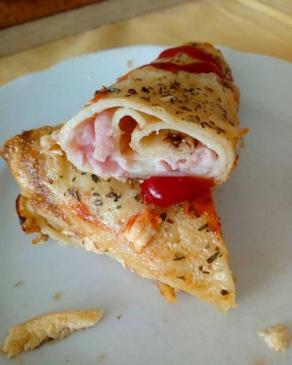 Napraviti standardne palačinke, zatim puniti rendanom šunkom i kačkavaljem, uviti i ređati u pleh. Odozgo preliti mešavinom od 1 jajeta i jogurta. Narendati kačkavalj, dodati origano, bosiljak, ko šta voli i zapeći oko 10 -15 min na 220 stepeni. Prijatno.