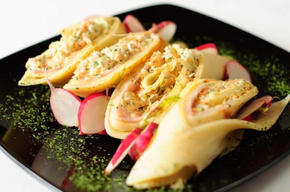 Prvo napravite palačinke. Zatim skuvajte šargarepu i sitnije je iseckajte, a spanać blanširajte i iseckajte. Pripremite želatin (po uputstvu sa kesice) i dodajte u sir. Zatim u tu smesu dodajte rendani kačkavalj, a potom i spanać i šargarepu. Staviti na palačinku šunku, pa zatim fil. Ukoso isecite palačinke servirajte ih ukrašene svežim rotkvicama isečenim na kolutove.