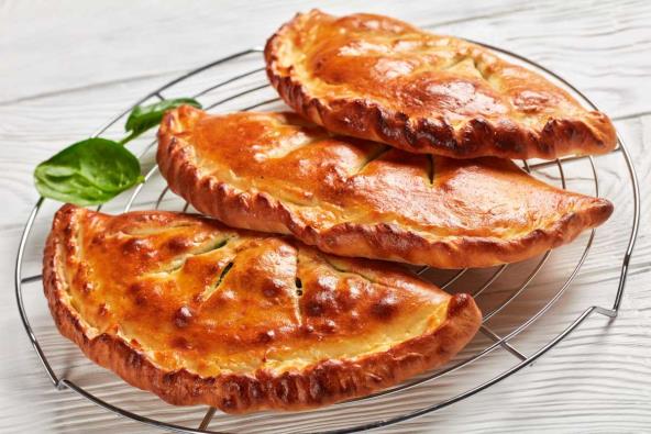 Nežno preklopite testo na pola, malo premažite krajeve vodom i stegnite ih, a zatim viljuškom pritisnite. Ponovite sa preostalim testom. Kalcone stavite u pripremljen pleh i vrhove premažite uljem i posolite. Nožem napravite tri reza na vrhu kalcone. Na pola pečenja ih izvadite i još jednom premažite uljem. Pecite dok ne dobije zlatnu boju.