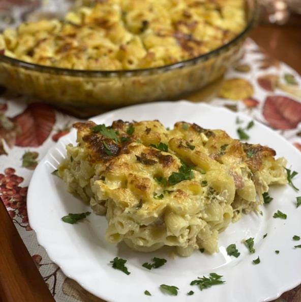Slaninicu propržiti bez ulja kako bi bila hrskava. Zatim je dodati u makarone zajedno sa iseckanom obarenom piletinom. Promešati i presuti u posudu za pečenje. Umutiti jaja, posoliti, dodati ulje, sir, pavaku i pavaku za kuvanje. Po želji dodati iseckani peršun. Sjediniti pa preliti preko makarona. Peći na 200 stepeni 25-30min. Prijatno!