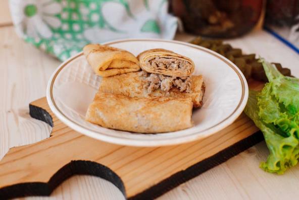 3. Rernu zagrejati na 200 stepeni. Ispeći deblje palačinke na ulju. Palačinke filovati mlevenim mesom i urolati. Poređati ih u podmazani kalup, pa ih odozgo posuti preostalim sirom. Ako je ostalo još fila, rasporediti ga oko rolnica. Rolnice peći na srednjoj žici rerne oko 20 minuta, dok ne dobije zlatnožutu boju.