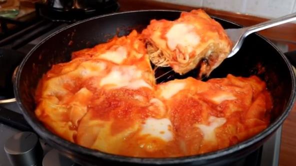 U tiganju propržite sitno seckani crni luk i beli luk, pa dodajte mleveno meso, seckani kulen, začinite i pržite nekoliko minuta. Dodajte vodu, paradajz sos i ostavite da se krčka petnaestak minuta. Dodajte izlomljene kore za lazanje, pelat i bosiljak. Poklopite tiganj i ostavite na vatri dvadesetak minuta dok se testenina ne skuva. Dodajte sremski sir, kačkavalj i mocarelu, ponovo poklopite i krčkajte još koji minut dok se sir ne rastopi.