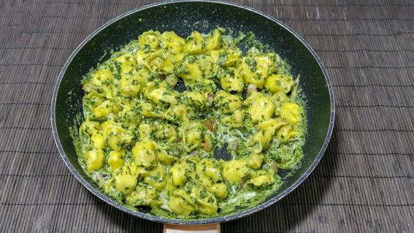 Skuvajte torteline u vreloj vodi, 10 minuta. U tiganj stavite slaninicu, propržite. Izvadite iz tiganja. Dodajte luk i brikete spanaća.