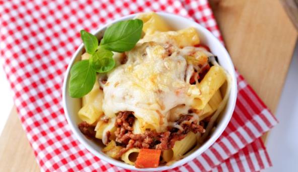 1. U tiganju ugrejte malo ulja i propržite mleveno meso i šargarepu. Procedite ga i pomešajte sa skuvanom testeninom, paprikom, iseckanim crnim lukom, paprikom i sosom. Posolite i dodajte začine po želji - origano, bosiljak...