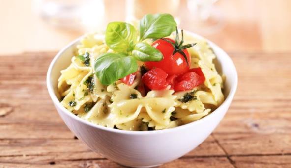 2. Pastu skuvajte prema uputstvu na pakovanju. Iscedite testeninu i isperite. Dodajte pastu piletini i pažljivo promešajte. Sipajte ostatak preliva i iseckan paradajz.