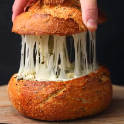 Istopite puter, pa dodajte sitno seckani peršun i beli luk. Promešajte. Isecite vrh hleba i izdubite sredinu. Premažite sa aromatičnim puterom i ivice i sredinu, a vrh koji ste isekli isto premažite tamo gde je mekano. Pecite u rerni dok ne dobije zlatnu boju. Ispržite meso, pa izvadite iz tiganja, i u njega dodajte malo ulja, seckanu slaninu i propržite. Prelijte pavlakom za kuvanje, pa dodajte pesto sos. Promšejate i kratko kuvajte. Vratite iseckanu piletinu i dodajte kuvane makarone i parmezan pa promešajte. Sipajte smesu u lepinje i pospite rendanom mocarelom. Vratite u rernu na još 5 minuta samo da se sir otopi.