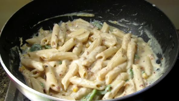 Skuvajte makarone i procedite. Zatim u tiganju na malo ulja propržite seckani beli luk, pa dodajte papriku, šargarepu i kukuruz. Kratko propržite i onda izvadite iz tiganja. U istom tiganju istopite puter, dodajte brašno i promešajte dobro, pa sipajte mleko. Non stop mešajte, pa kada proključa dodajte začine, opet malo krčajte, pa vratite povrće i makarone. Promešajte da se sve sjedini i još kratko krčkajte.