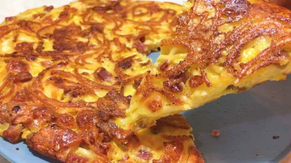 Skuvajte špagete, a mocarelu i kobasicu isecite na kockice. Jaja umutite, posolite i pobiberite, pa dodajte seckanu kobasicu, mocarelu i parmezan. Sve dobro sjedinite. Istopite puter, pa stavite skuvane špagete. Zatim sipajte preko preliv, dobro sjedinite i pecite sa obe strane.