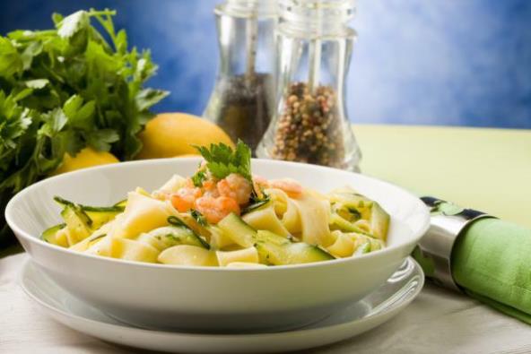 3. Skuvati pastu u dosta slane vode, prema uputstvu s pakovanja. Procediti i izmešati s povrćem i račićima. Iseckati peršun i umešati. Servirati uz hladno belo vino.