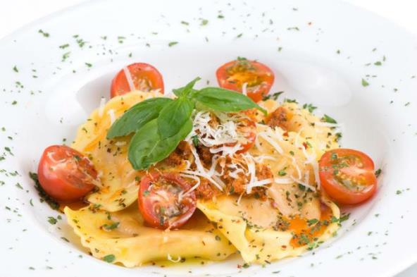 4. Staviti ravioli u tanjire, preliti ih zagrejanim puterom (ili hladno ceđenim maslinovim uljem), posuti ih rendanim parmezanom i origanom i ukrasiti koktel paradajzom isečenim na polovine i svežim bosiljkom