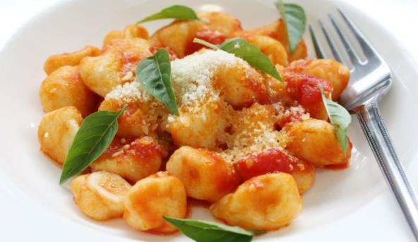 3. Zamesite mekano testo na pobrašnjenoj podlozi. Podelite na 4 dela i oblikujte valjke širine oko 3 cm. Nožem secite na komade debljine oko 1 cm. Vlažnim rukama pravite njoke i odlažite ih na tanjir.