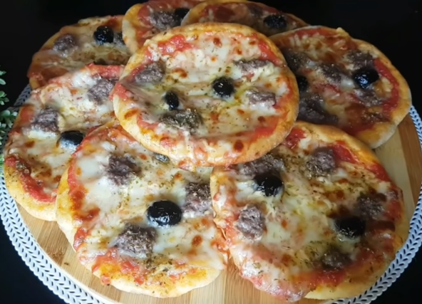 Razvucite prstima kako biste dobili tanje krugove. Stavite na pleh obložen pek papirom. Pomešajte pelat, kašiku maslonovog ulja i sipajte malo origana. Dobijenom smesom premažite testo. Preko stavite malo rendanog sira i mlevenog mesa ili šunke. Stavite masline i pospite origanom. Pecite na 250°C oko 15 minuta.