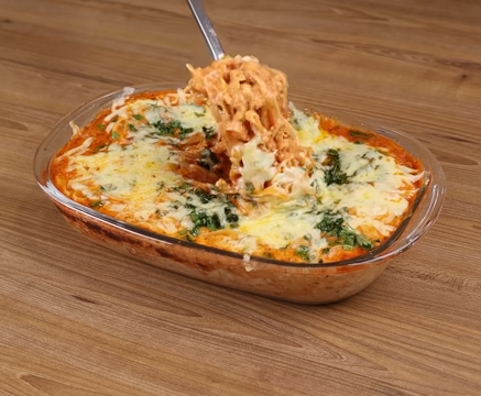 Skuvajte testetninu. U vatrostalnu posudu sipajte paradajz sos, rednanu mocarelu ili neki drugi tvrdi sir, pavlaku ili krem sir, parmezan, ulje, so, biber, origano, pa pecite na 180°C oko 20 minuta. Promešajte, pa sipajte kuvanu testeninu i opet promešajte. Pospite seckanim peršunom i sa još malo rendanog sira. Vratite u rernu da se sir otopi.