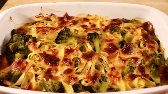 Brokoli isecite, pa kratko propržite sa mlevenim belim lukom u tiganju. Sipajte vodu i kuvajte poklopoljeno nekih 5 minuta. Dodajte taljatele i kuvajte dok ne omekšaju, uz povremeno mešanje. Dodajte parmezan, promešajte, pa sipajte u tepsiju. Preko pospite mocarelu ili neki drugi rendani sir po izboru. Pecite na 180°C oko 10 minuta.