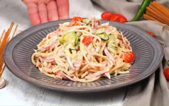 Propržite sitno seckani beli luk sa šunkom isečenom na trake. Dodajte tikvice isečene na baš tanke kolutove i sipajte pavlaku za kuvanje. Pred kraj dodajte zdenak sir. Mešajte dok se sve ne otopi, pa dodajte kuvane špagete. Krčkajte još 5 minuta, pa stavite seckani čeri i ostavite još 2-3 minuta.