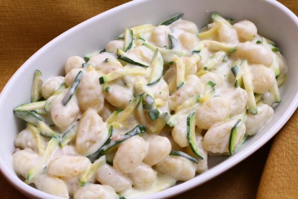 Tikvicu izrendajte ili isecite na tanje delove, posolite i ostavite sa strane da odstoji. Posle nekog vremena ocedite višak vode i stavite tikvice u zagrejan tiganj sa malo ulja. Dinstajte ih nekoliko minuta, potom dodajte pavlaku za kuvanje, naseckan bosiljak i začine po ukusu i dinstajte do željene gustine. Vodite računa da ne prekuvate sos - trebalo bi da ostane tečan kako bi ga njoke upile. U odvojenoj posudi skuvajte njoke uobičajeno i sjedinite sa sosom od tikvica. Pre služenja njoke pospite parmezanom ili drugim sirom po ukusu.