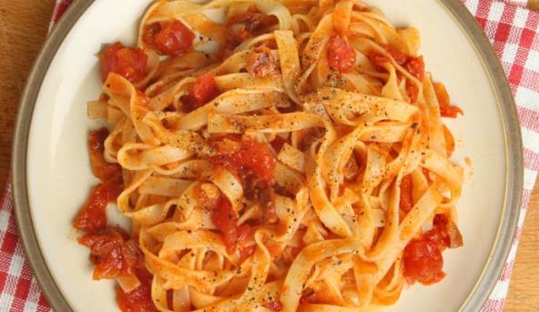 3. Slaninu nasecite na trakice, pa je zajedno sa papričicom i belim lukom prodinstajte na vrućem ulju. Umešajte paradjaz i dinstajte još pet minuta. Posolite i pobiberite. Testeninu ocedite, dodajte paradajzu i kratko zagrejte, promešajte i raspodelite na tanjire. Pospite peršunom i parmezanom.