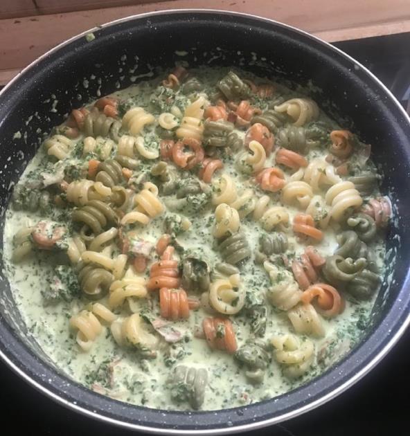 Slaninu iseckajte i propržite, a zatim dodajte seckani beli luk i spanać. Dinstajte 10-ak minuta, pa začinite po želji. Sipajte pavlaku za kuvanje i dodajte kačkavalj. Promešajte i ostavite sos na niskoj temepraturi. Povremeno promešajte. Skuvajte testeninu, procedite, dodajte u sos i promešajte. Služite.