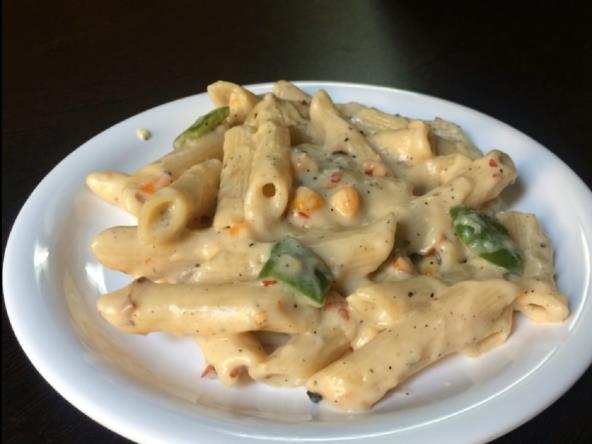 Makarone skuvajte i procedite, a beli luk ispržite, pa dodajte papriku i šargarepu iseckanu na kockice, pred kraj dodajte i kukuruz, pa promešajte. Izvadite iz tiganja, pa stavite puter da se otopi. Dodajte brašno i mešajte dok ne dobije boju, pa sipajte mleko. Posolite, pobiberite i dodajte tucanu papriku, mešajte i kuvajte još par minuta. Dodajte povrće, makarone i lepo promešajte da se sve sjedini.