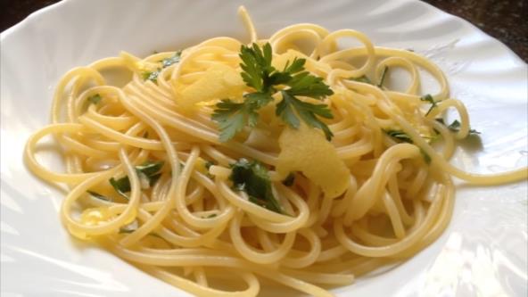 Makarone skuvajte kao i uobičajeno i ostavite jednu šolju vode u kojoj se pasta kuvala za kasnije. U tiganju zagrejte maslinovo ulje, dodajte maslac, pa kada se rastopi propržite sitno naseckan beli luk. Kada je dobio rumenu boju, sipajte sok od limuna i vodu u kojoj se kuvala testenina, pa kuvajte na umerenoj vatri dok ne proključa. Dodajte skuvanu testeninu, izrendajte koricu limuna, dodajte začine po ukusu, sve dobro promešajte i krčkajte nekoliko minuta. Nakon toga pospite sveže seckanim bosiljkom ili peršunom, pospite parmezanom i služite dok je još topla.